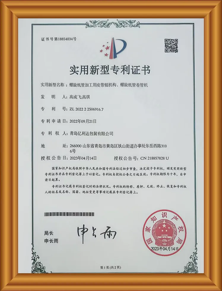 Våre produkter er FSC-sertifisert, ISO9001-sertifisert, har syv patenter, inkludert en praktisk U-formet papirrørmaskin, et spesialisert og innovativt sertifikat for små og mellomstore bedrifter, Puni-testing og et kvalitetsleverandørsertifikat.